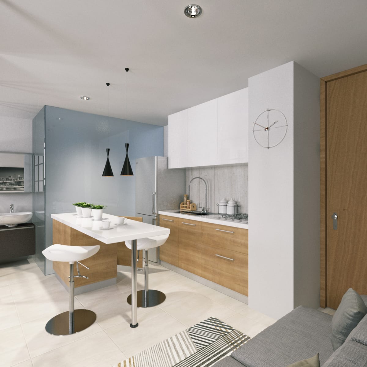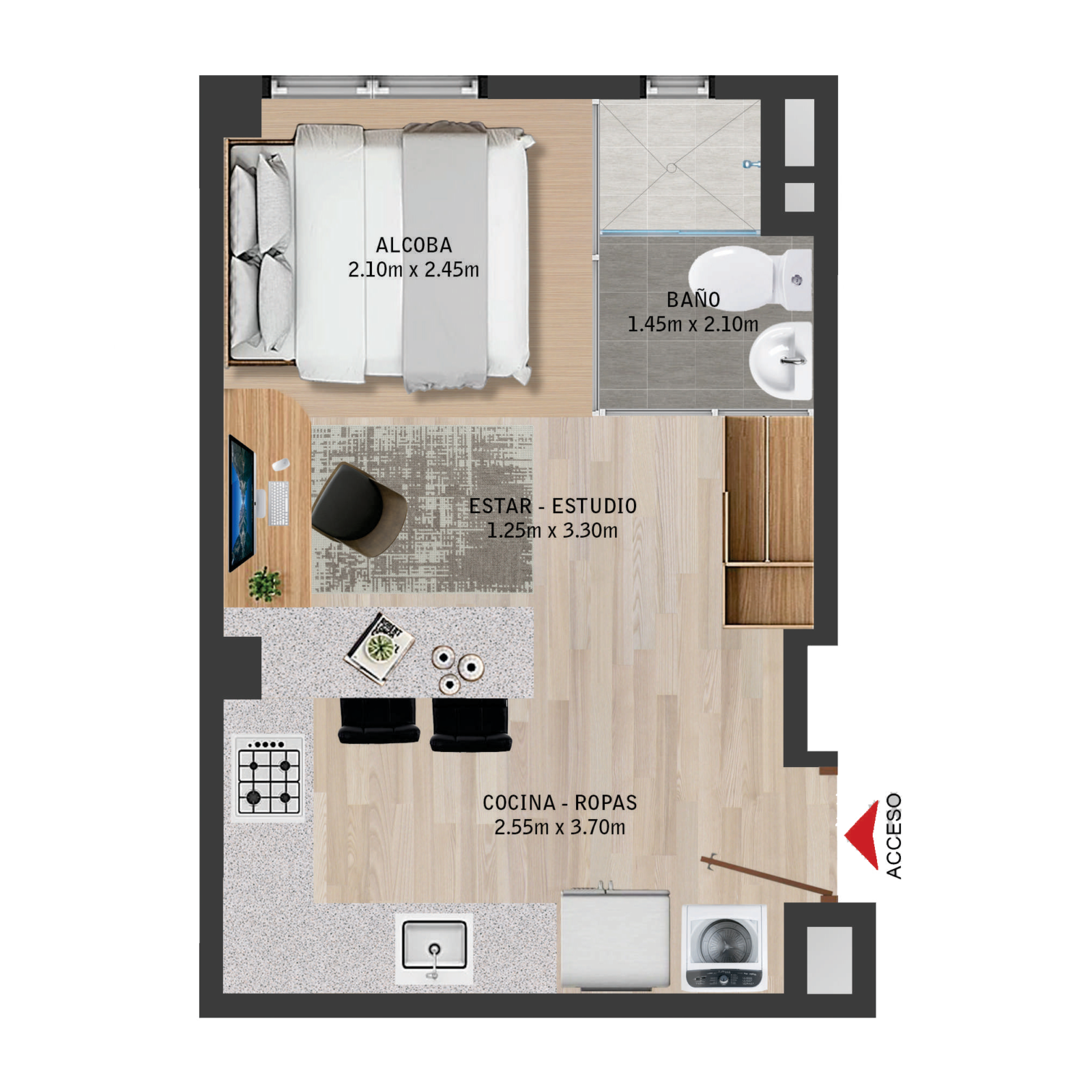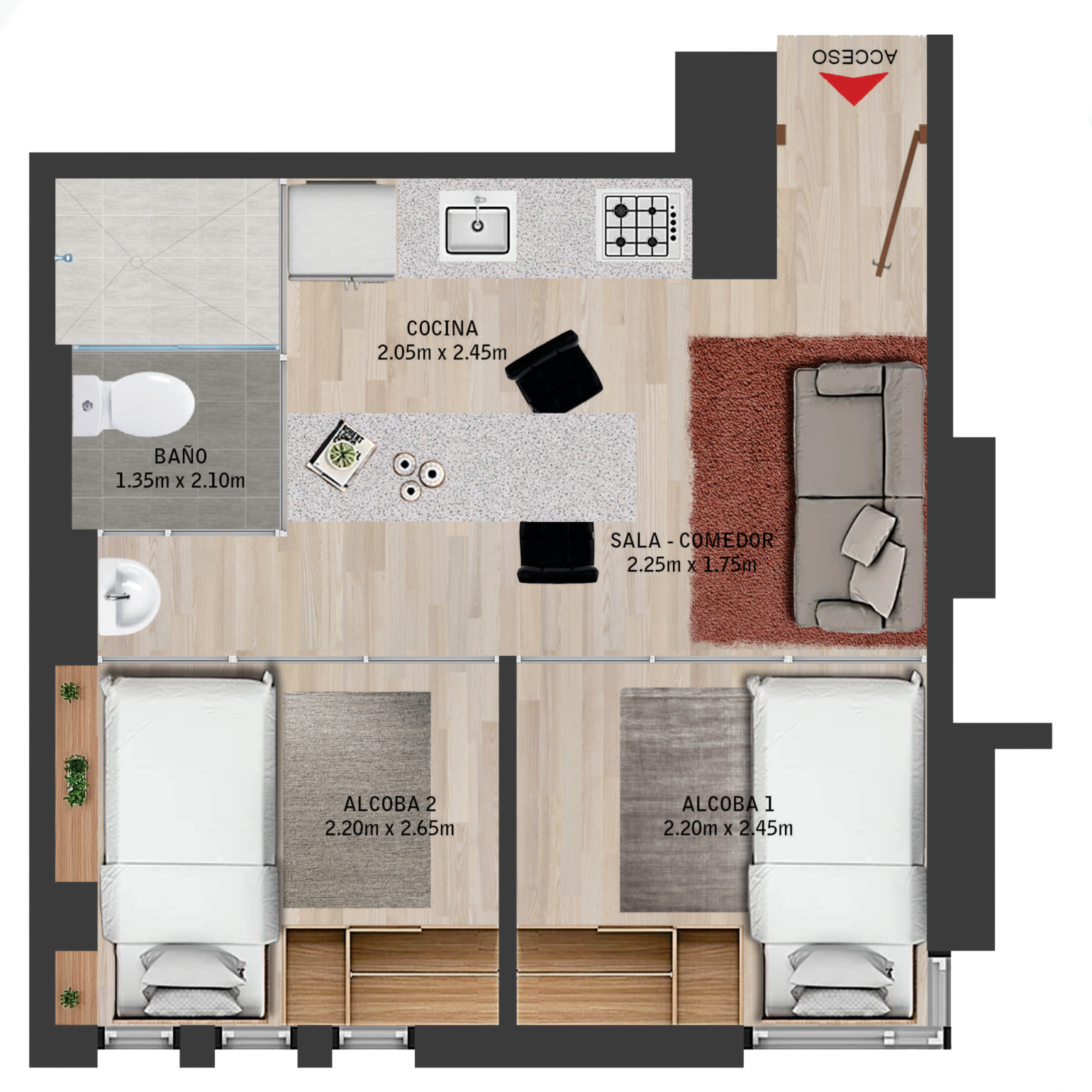 En este moderno apartamento de Niza disfrutarás Dos habitaciones, Barra Americana, baño cabina de vidrio, zona de ropa, cocina integral, Espacio Sala y Clóset de Madera.