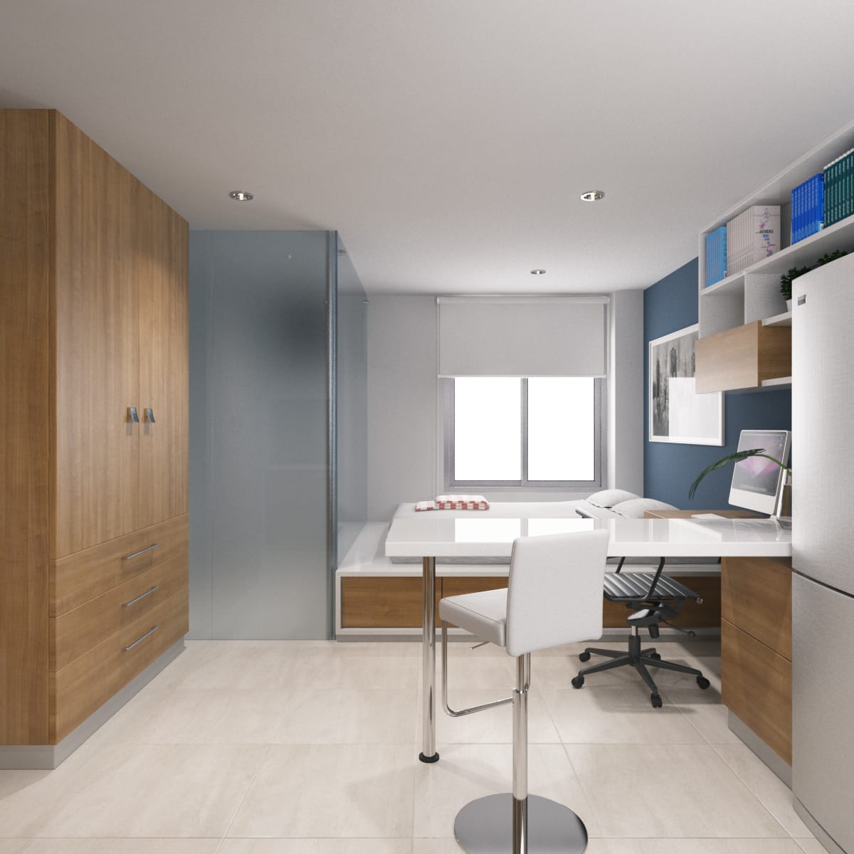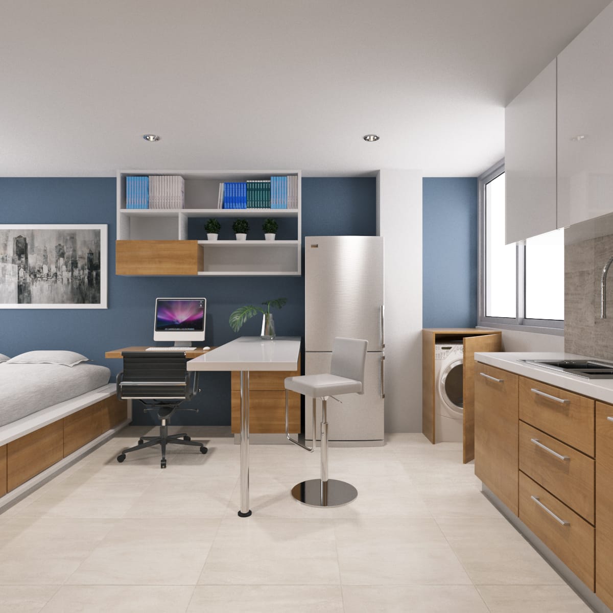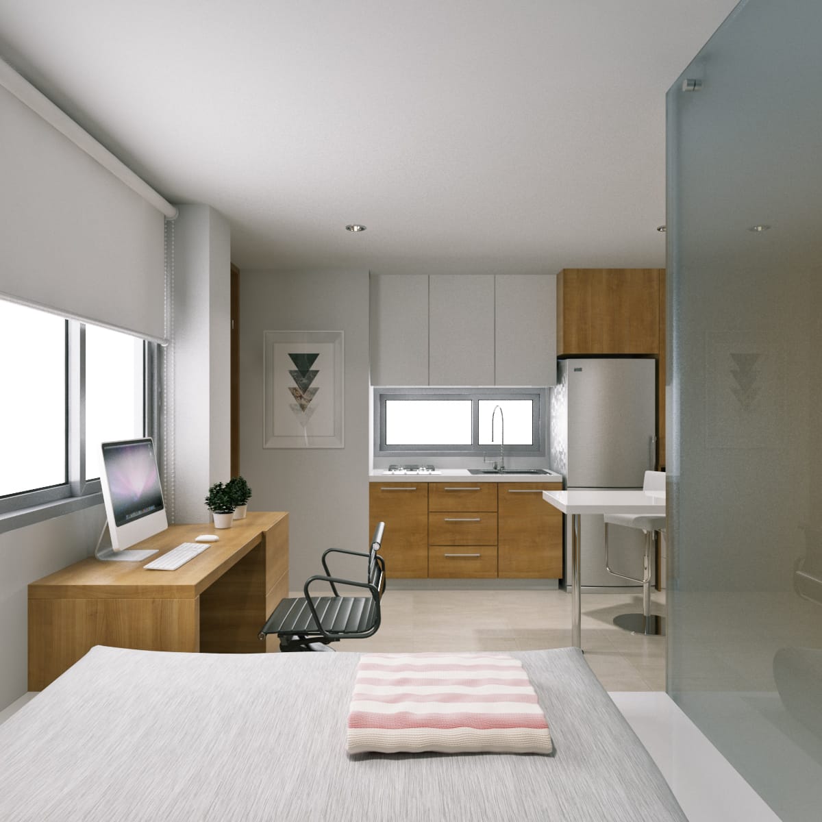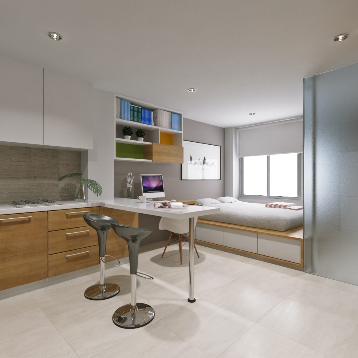 En este moderno apartamento de Niza disfrutarás Una habitación, cama empotrada, un baño con cabina de vidrio, clóset madera, zona de ropa, cocinal integral.