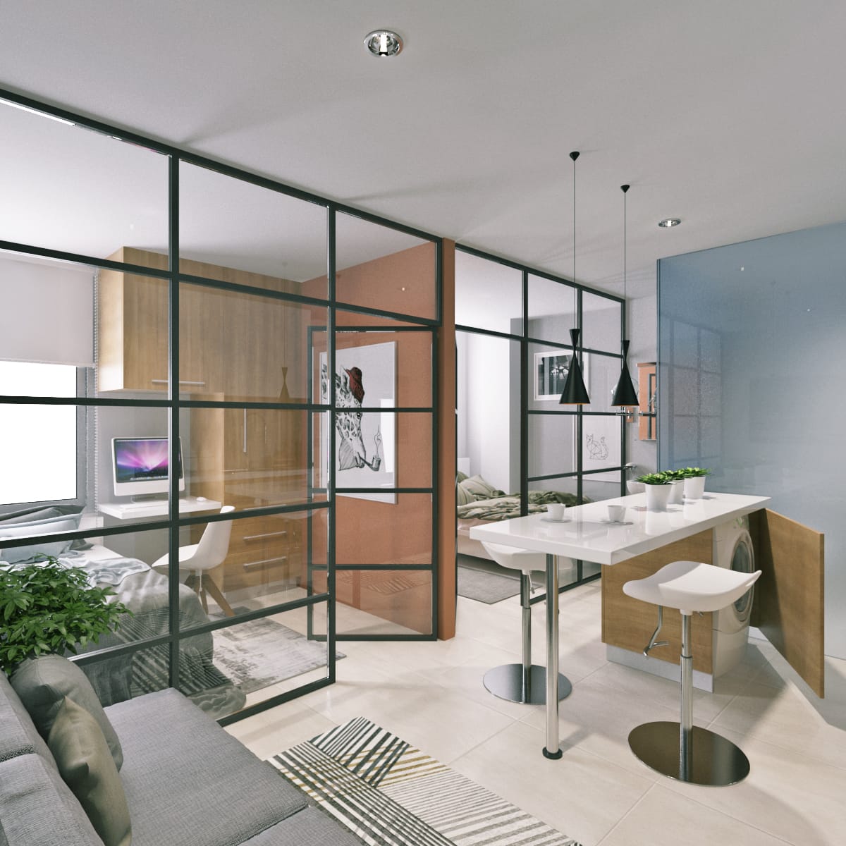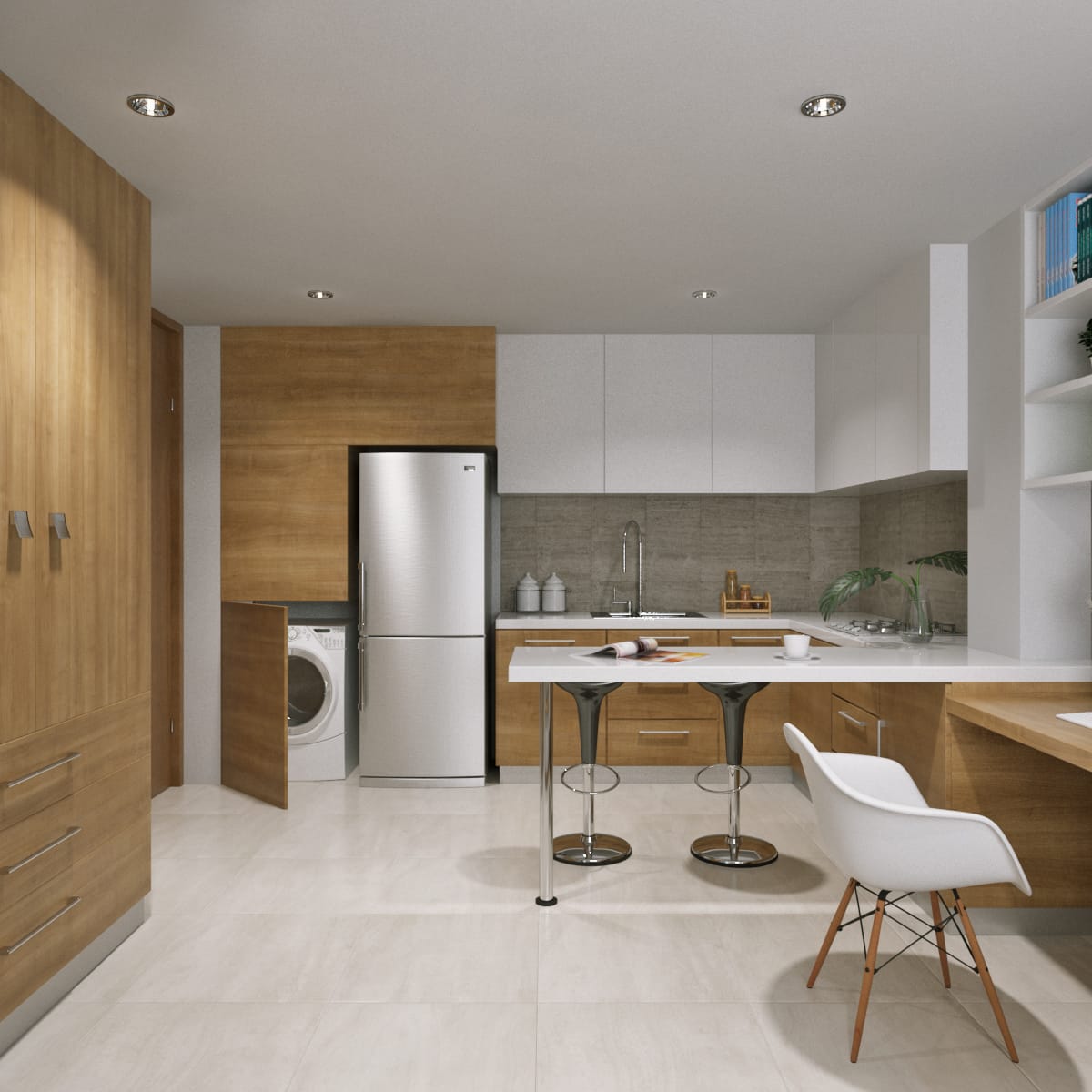 En este moderno apartamento de Niza disfrutarás de 2 habitaciónes, cama empotrada, un baño con cabina de vidrio, 2 clósets madera, 1 escritorio, barra americana, cocinal integral.